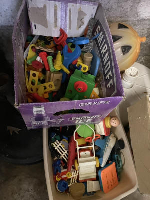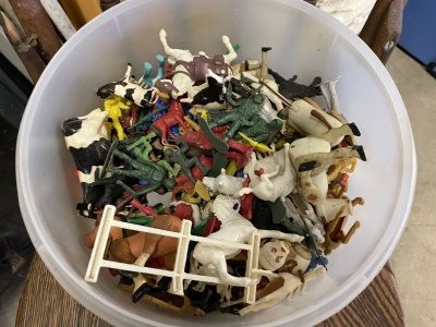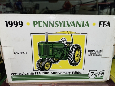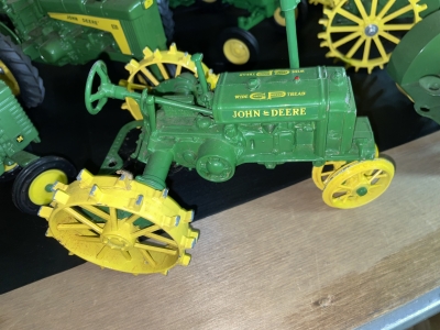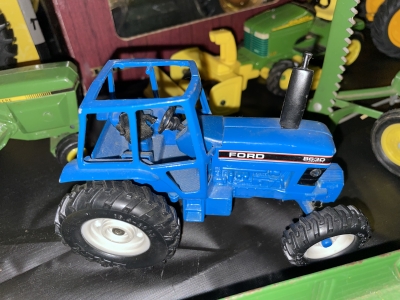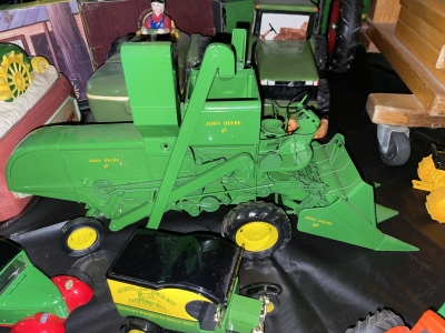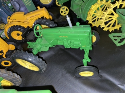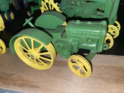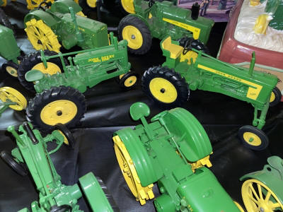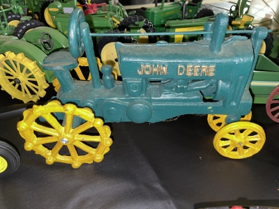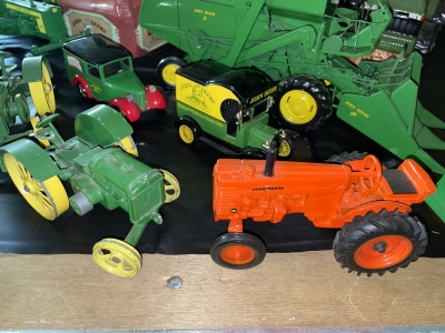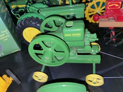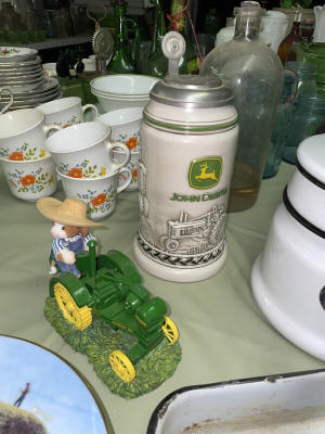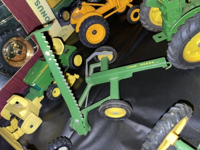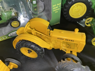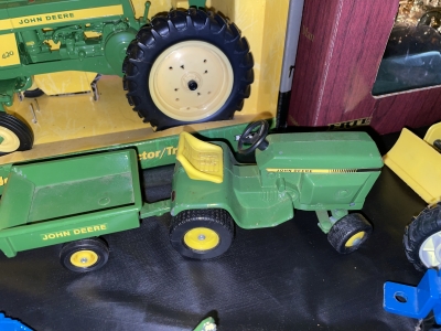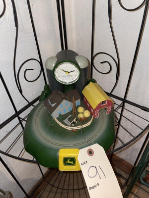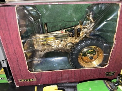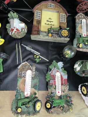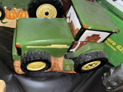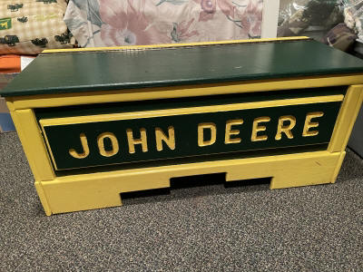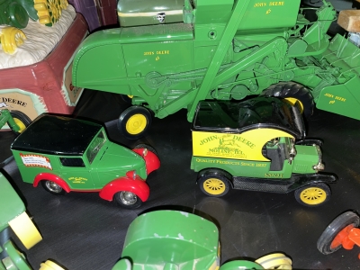 Large John Deer Collection: Cast Iron Seat, Cast Iron Tractors, Implements, Clocks, Lamps, Figurines, Toys, Cookie Jars, Canister Set, Dishes, Kitchenware, Salt & Pepper Sets, Toy Chest, Stool, Ornaments, Wooden Chest, Bird Feeder, Blankets, Many, Many Items, etc.